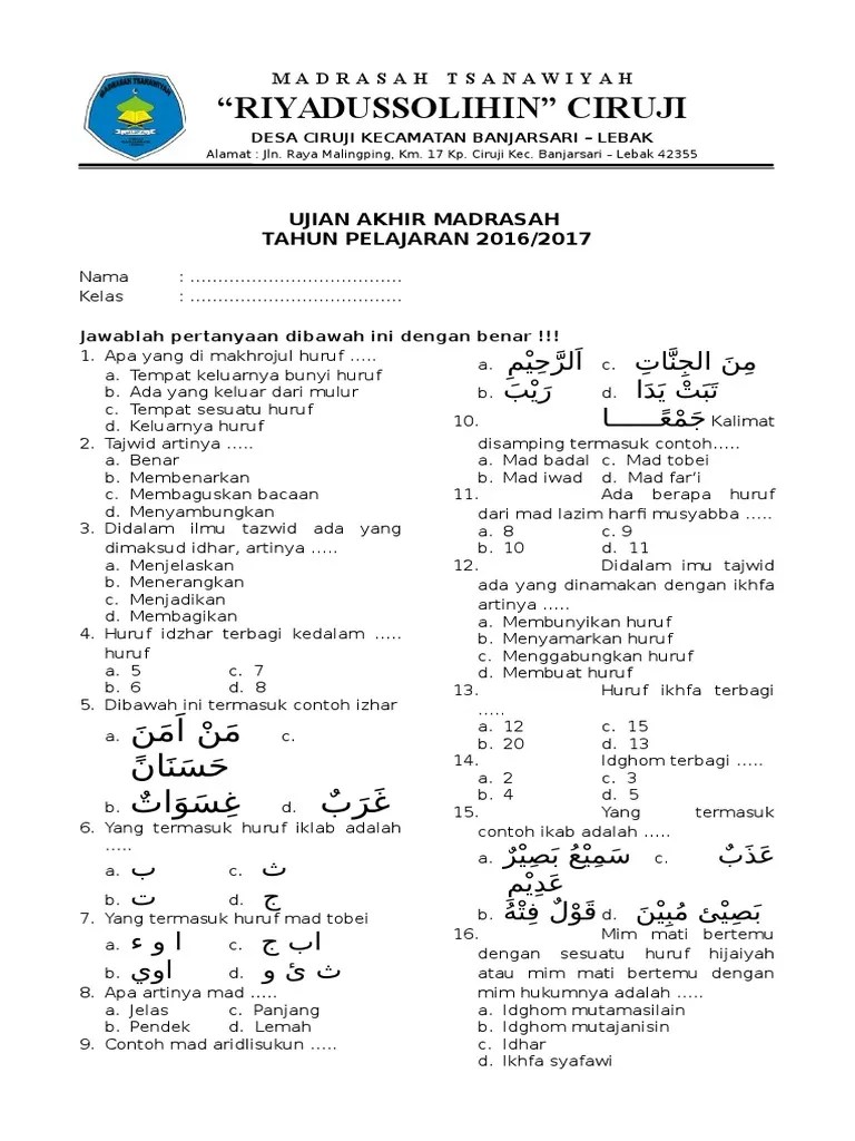 Kunci jawaban contoh soal uas btq sd mi kelas 6 nomor 1 di atas ialah c. 20200402 sharedownload contoh soal ujian semester 2 untuk kelas 2 mata pelajaran baca tulis al quran yang biasa disingkat dengan bta atau btq. Sebenarnya masih banyak contoh soal soal matematika kelas 2 sd semester 2. Contoh lafal yang memiliki bacaan idhar. Pilihan ganda beri tanda silang (x) a, b, c, atau.